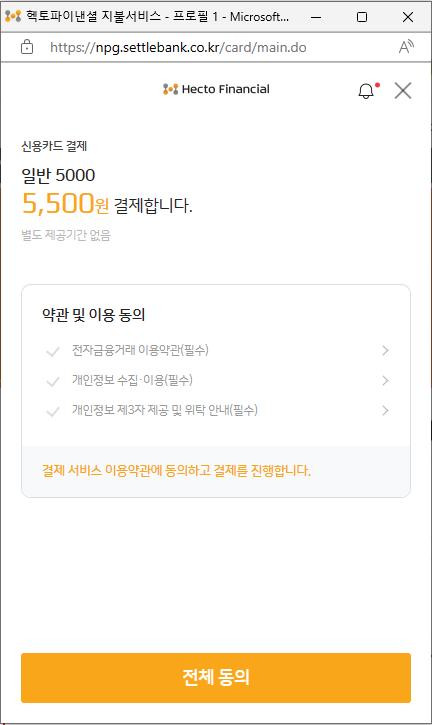 2. 신용카드 결제창에서 [전체동의 ] 부탁 드립니다.