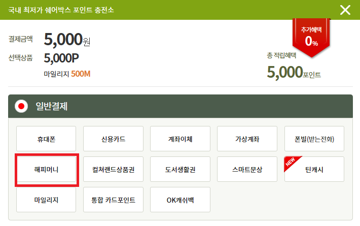 ※ 쉐어박스에서 결제 진행하시기전에 해피머니 사이트에서 해피머니 상품권을 등록 하신 후에 결제 진행이 가능하오니, 참고부탁드립니다.