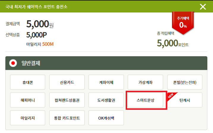 1. 결제선택 창에서 [스마트문상] 클릭 시 게임상품권 결제창이 확인 됩니다.