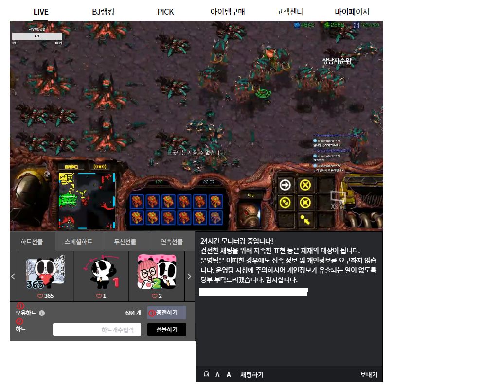 ② 하트 : 선물 가능한 하트에서 개수를 정하여 우측의 선물하기 버튼을 이용하여 후원