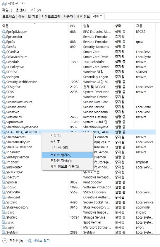 1. CTRL + SHIFT + ESC 키를 눌러 작업관리자를 엽니다 (작업표시줄에서 우측마우스 버튼을 눌러 작업관리자를 열어주셔도 됩니다) 2 . 서비스 탭을 선택한 다음 SHAREBOX_LAUNCHER 가 실행 중인지 확인한 다음 사용안함 되어있을 경우 우측 마우스를 눌러 서비스 열기를 해줍니다